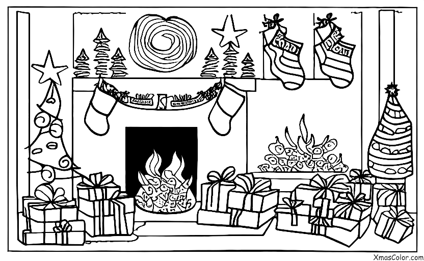 The dog is curled up in a cozy spot by the fireplace. The fireplace is decorated with stockings and a wreath.