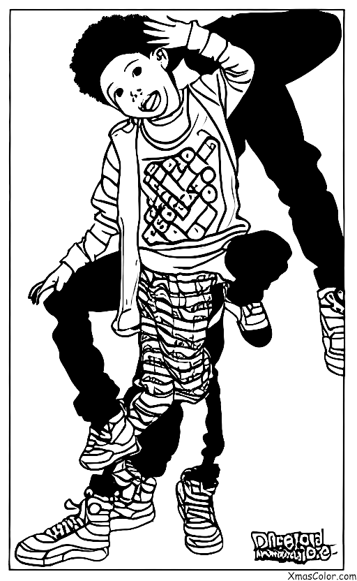 He is wearing baggy jeans and a hoodie, and he looks like he’s ready to bust a move.