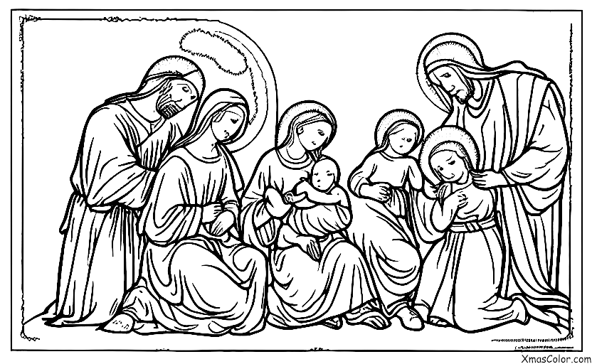 Mary and Joseph are kneeling. They are looking at Baby Jesus with love. Baby Jesus is sleeping in the manger.