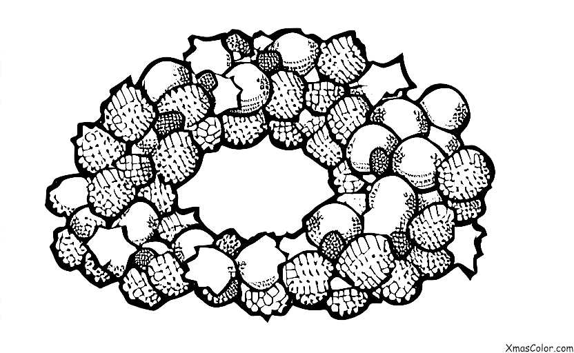 A wreath made entirely of popcorn. It is decorated with red and green candies, berries, and ribbons.