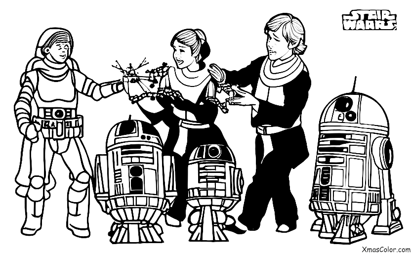 Luke and Leia are decorating a Christmas tree in the Rebel base on Hoth. R2D2 and C3PO are helping them.