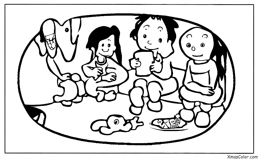 The kid is looking at their parents who are now frogs. They are sitting in the middle of wrapping paper and presents. The child looks horrified.