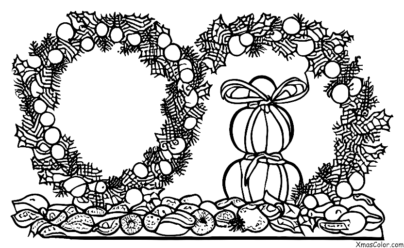 The wreath is made of different fruits, with a red ribbon tied around it.